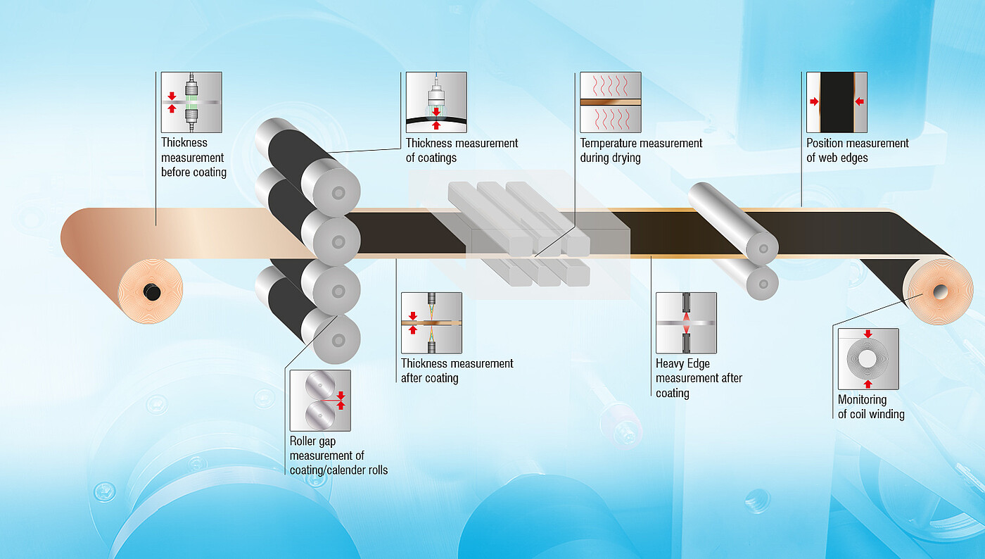 Los sensores cromáticos confocales y los interferómetros de luz blanca destacan por su eficacia en la medición óptica en línea del grosor de láminas de baterías. Los sensores suelen utilizarse para supervisar y controlar procesos de revestimiento en húmedo, pero son también adecuados para procesos en seco.