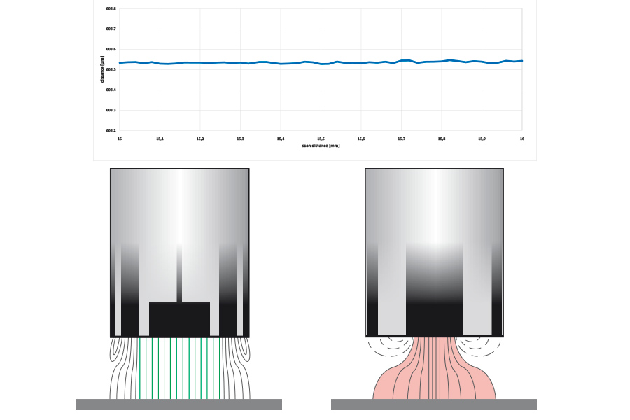 Los sensores capacitivos funcionan por detección de cambios en la capacitancia. En los condensadores de placas, la capacitancia entre dos placas de tamaño constante cambia cuando se modifica la distancia o se introduce un dieléctrico en el hueco de medición. En el método de medición capacitiva, el sensor (electrodo de medición) y el objeto de medición conductor actúan como un condensador de placa ideal. Si por el condensador del sensor fluye una corriente alterna de frecuencia constante, la amplitud de la tensión alterna en el sensor es proporcional a la distancia del objeto de medición (electrodo de masa). Para una medición constante, se requiere una constante dieléctrica invariable entre el sensor y el objeto a medir.